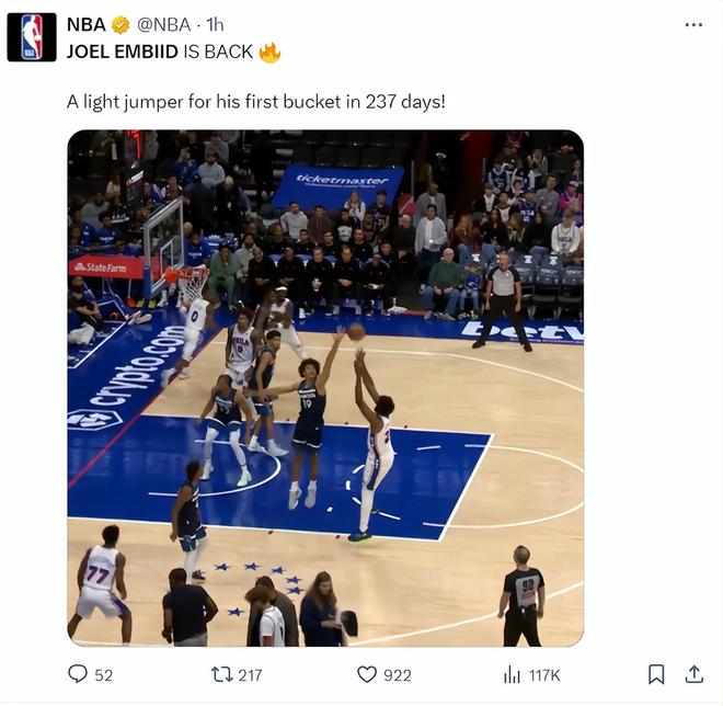 NBA官方全程记录着大帝的复出,开场第二攻就是大帝持球的撤步中距离,那个技术细腻的常规赛MVP还在,恩比德还是那么的厉害,NBA官方写道:时隔237天的第一次跳投得分。