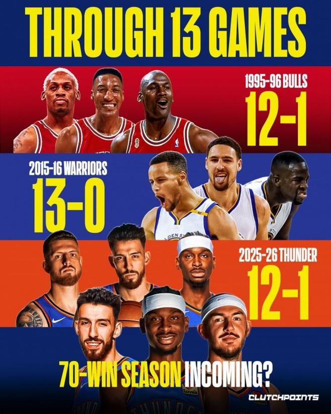 开赛13场后,雷霆以12胜1负的战绩追平了96公牛的同期纪录,OKC在13场比赛中净胜对手202分。本赛季,雷霆有望在常规赛冲击70+的胜场数。